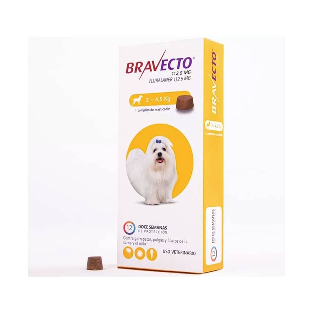 BRAVECTO es el único comprimido palatable que protege a tu perro hasta 12 semanas contra pulgas y garrapatas. Antiparasitario externo con forma de comprimido masticable que sirve para la prevención, control y tratamiento de infestaciones de pulgas y garrapatas en perros. Es de acción sistémica y actúa en forma inmediata persistiendo durante 12 semanas para matar garrapatas (Ixodes ricinus y Rhipicephalus sanguineus adultas y juveniles) y pulgas (Ctenocephalides felis y Ctenocephalides canis).