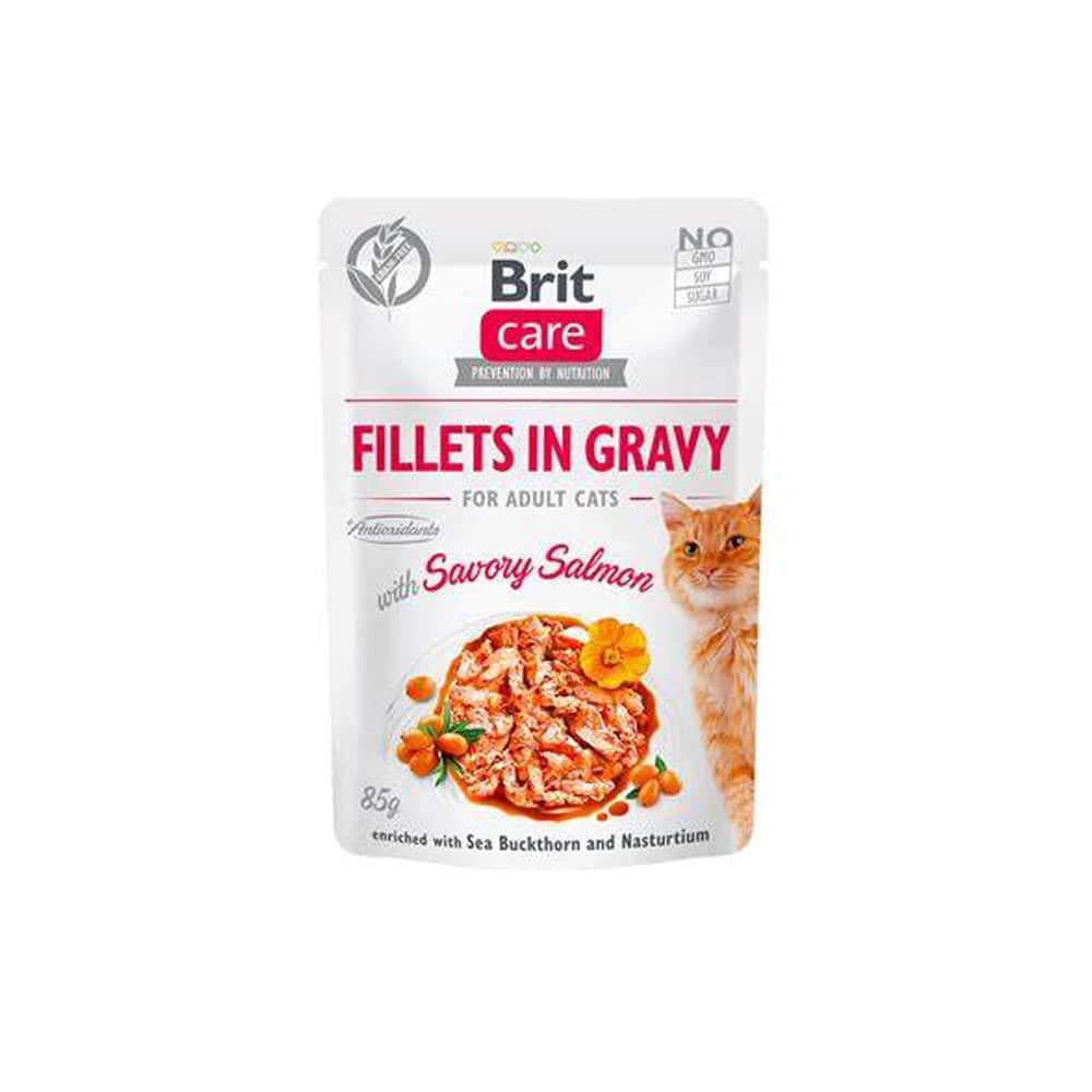 Brit Care Filetes de Salmón en Salsa es un alimento muy apetitoso, sin cereales, compuesto por deliciosos filetes de carne en salsa (85%), espino amarillo y capuchina para ayudar a contrarrestar la aparición de problemas del tracto urinario.