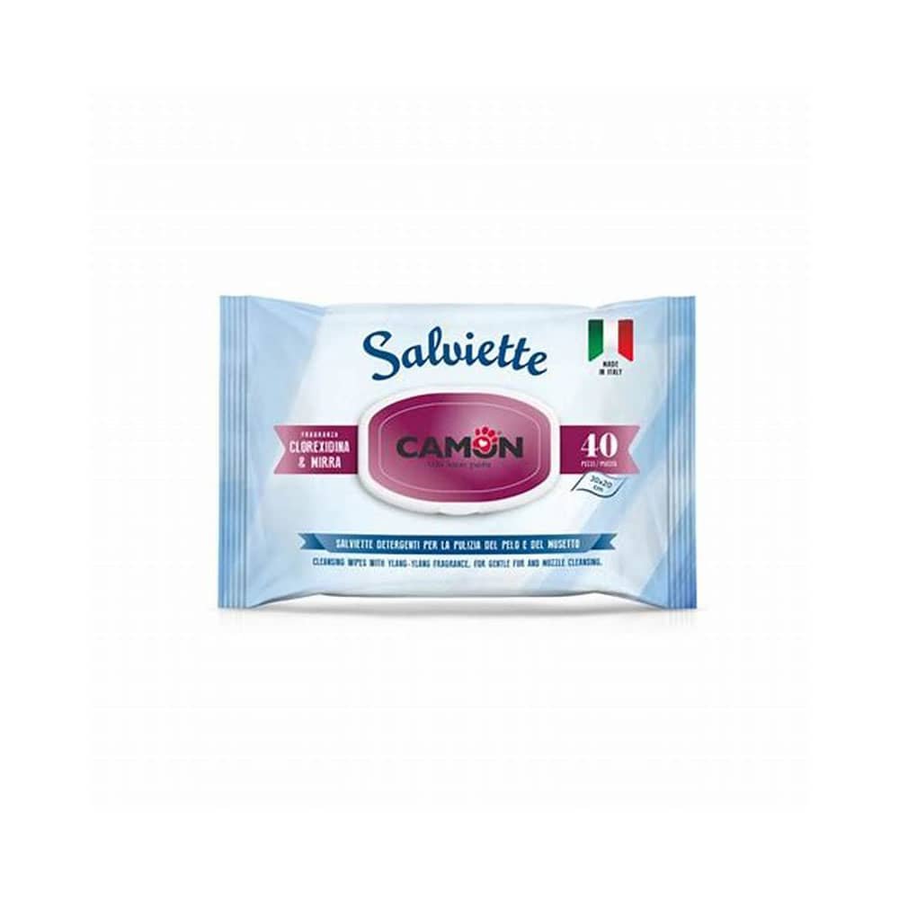 Toallitas de Limpieza de Clorhexidina para Perros y Gatos, ideal para proteger, refrescar, limpiar y eliminar el mal olor de tu mascota. Creado por Camon. Toallitas de limpieza con aroma de mirra y clorhexidina (0.3%) para mascotas ayuda a refrescar, proteger y actuar como antibacteriana. Ideal para eliminar cualquier mal olor y para limpiar su pelaje, patas, hocico u orejas y son perfecta para mantenerlas a mano en casa o durante viajes. 40 toallitas, miden 30 cm x 20 cm.