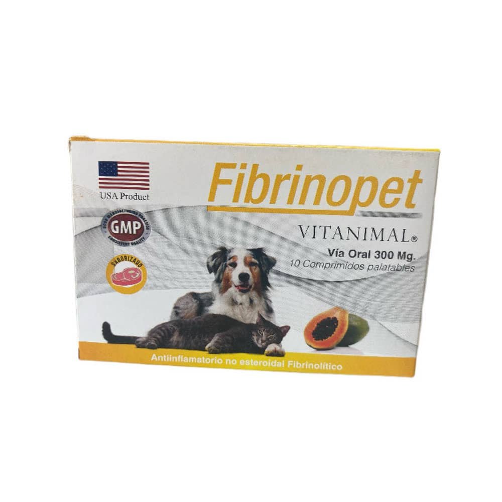 Fibrinopet: Es un comprimido oral que contiene bromelina, una enzima extraída de la piña, con acción antiinflamatoria y fibrinolítica. Se usa para tratar hematomas, inflamaciones y edemas producidos por lesiones traumáticas o inflamatorias en perros y gatos.