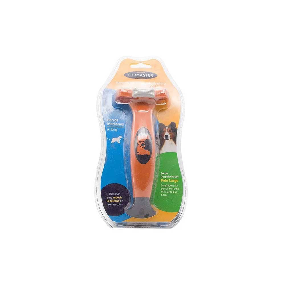 «Furmaster M Pelo Largo es una herramienta despelechadora, diseñada para reducir la pelecha de su mascota, recomendados para la eliminación todo el pelo muerto del pelaje de tu mascota. La ergonomía de tu herramienta despelechadora es importante si deseas cepillar de manera cómoda y rápida. Esta ergonomía la encontrarás en el mango del cepillo Furmaster M Pelo Largo siendo resistente, cómodo de agarrar y antideslizante para un correcto agarre del mismo. Con este cepillo puedes peinar a tu perro, sin llegar a incomodarlo al realizar el proceso, ya que las púas tienen un diseño especial para no causar molestias, siendo de acero inoxidable, recuerda que es super importante realizar un buen cepillado, capaz de eliminar los pelos muertos, activar el crecimiento del nuevo pelaje y producir bienestar a nuestros amigos felinos. Características: Cuenta con un Boton Eyector de pelo, que limpia y remueve lo pelos de la herramienta con facilidad Mango Antideslizante, hace que la herramienta sea fácil de agarrar Borde de acero Inoxidable, para el pelo largo que llega a lo profundo de la capa superior del pelaje eliminando de manera segura la primera capa y el pelo suelto. Recomendado para perros con un peso comprendido entre 9kg y 23 kg. Especial para pelaje largo.»
