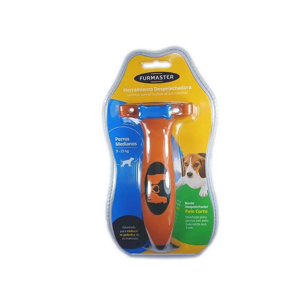 «Furmaster M Pelo Corto es una herramienta despelechadora, diseñada para reducir la pelecha de su mascota, recomendados para la eliminación todo el pelo muerto del pelaje de tu mascota. La ergonomía de tu herramienta despelechadora es importante si deseas cepillar de manera cómoda y rápida. Esta ergonomía la encontrarás en el mango del cepillo Furmaster M Pelo Corto siendo resistente, cómodo de agarrar y antideslizante para un correcto agarre del mismo. Con este cepillo puedes peinar a tu perro, sin llegar a incomodarlo al realizar el proceso, ya que las púas tienen un diseño especial para no causar molestias, siendo de acero inoxidable, recuerda que es super importante realizar un buen cepillado, capaz de eliminar los pelos muertos, activar el crecimiento del nuevo pelaje y producir bienestar a nuestros amigos felinos. Características: Cuenta con un Boton Eyector de pelo, que limpia y remueve lo pelos de la herramienta con facilidad Mango Antideslizante, hace que la herramienta sea fácil de agarrar Borde de acero Inoxidable, para el pelo corto que llega a lo profundo de la capa superior del pelaje eliminando de manera segura la primera capa y el pelo suelto. Recomendado para perritos de un peso comprendido entre 9kg y 23 kg. Especial para pelaje corto»