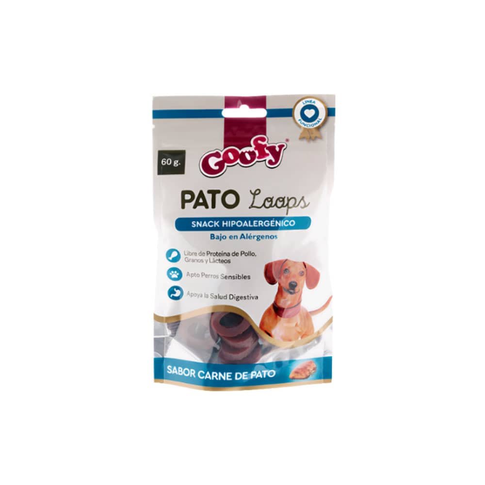 El Goofy Pato Loops (Hipoalergenico) de 60g, es un snack ideal para perros, es un delicioso premio formulado con ingredientes aptos para perros con sensibilidad alimentaria. Este snack está libre de proteína de pollo, granos y lácteos. El Snack Goofy Pato Loops está elaborado con proteínas de pato, apta para perros sensibles. Con extracto de corteza de magnolia y pro bióticos, para apoyar la salud digestiva. Omega 3 y 6 para un pelaje sano y brillante.