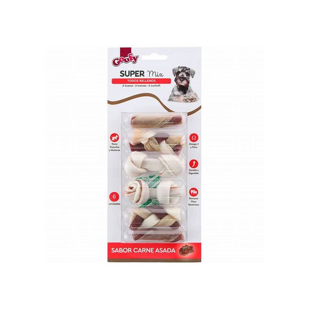 Contiene una variedad de 3 diferentes snacks: 2 huesos, 2 trenzas y 2 cuchuflís, todos rellenos y con sabor a carne asada. Con ingredientes altamente digestibles, para un diversión sana, segura y nutritiva.