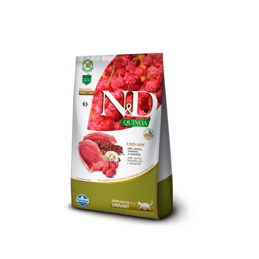 N&D Quinoa Feline Urinary Pato es un alimento completo y balanceado indicado para gatos adultos con tracto urinario sensible. Formulado con Pato, Quinoa, Cranberry y Manzanilla. Sin cereales ni gluten. Sin conservantes artificiales.