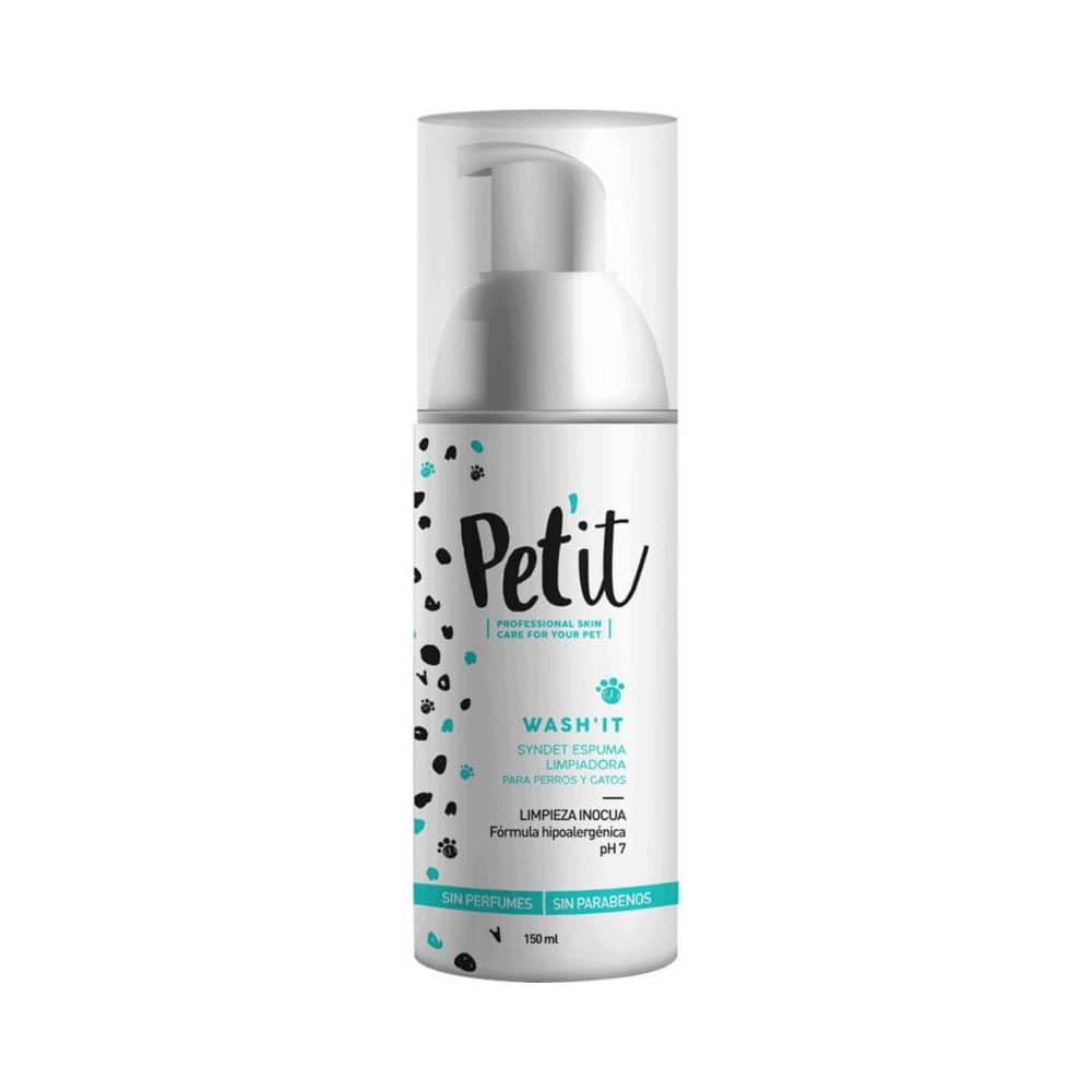 Pet’it Wash’it limpia y cuida la piel de las mascotas. Pet’it Wash’it es un syndet o espuma limpiadora, sustituto de champús, que entrega una limpieza profunda e inocua para la piel de las mascota. Con su fórmula hipoalergénica, urea (efecto hidratante) y extracto de avena (efecto antiinflamatorio) es perfecta para mascotas con problemas de hipersensibilidad cutánea. Wash’it solo actúa en las partículas de suciedad ajenas a la barrera de la piel, por lo que rinde más que los champús y jabones tradicionales. Pet’it Wash’it requiere enjuague.