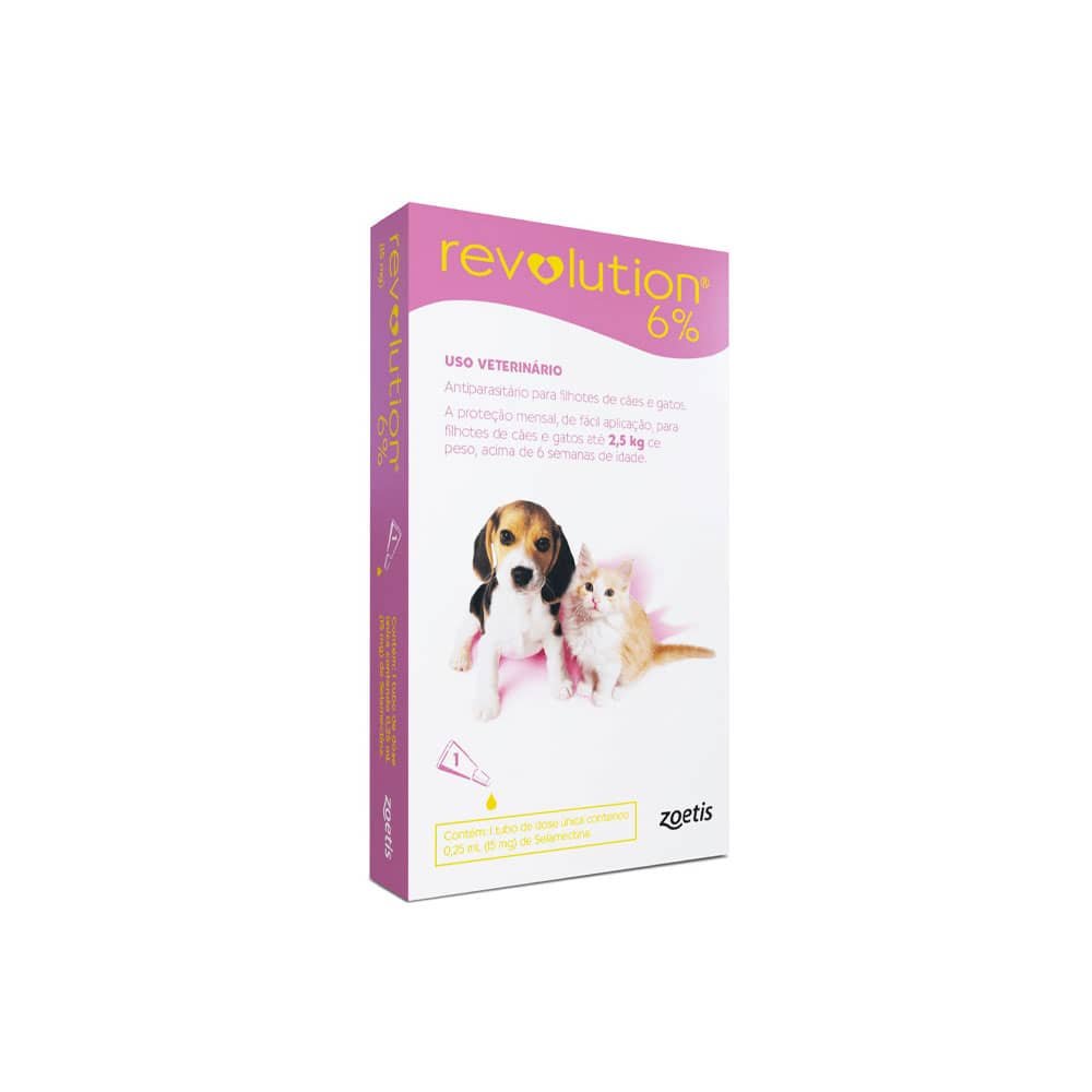 Revolution perros y gatos es un antiparasitario interno y externo de amplio espectro para perros y gatos de hasta 2,5 kg. Permite el control y tratamiento de parásitos eliminando pulgas adultas, larvas y previniendo la incubación de los huevos, además de controlar y tratar lombrices intestinales, Dirofilariasis y ácaros de la sarna.