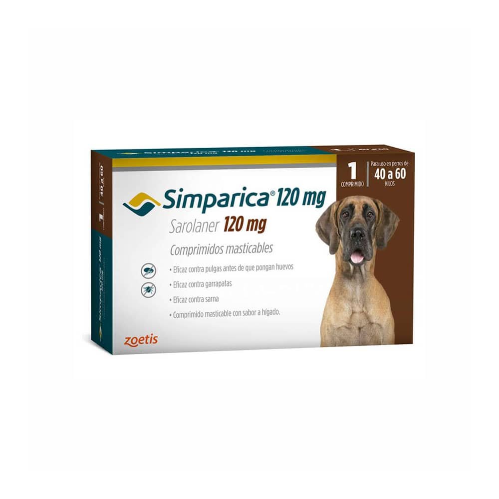 SIMPARICA® 120 mg de ZOETIS® es un comprimido masticable indicado para el tratamiento de infestaciones por pulgas, garrapatas y tratamiento de la sarna sarcóptica (Sarcoptes Scabiei), Sarna demodécica (Demodex Canis) y sarna Otodéctoca (Otidectes Cynotis) en perros