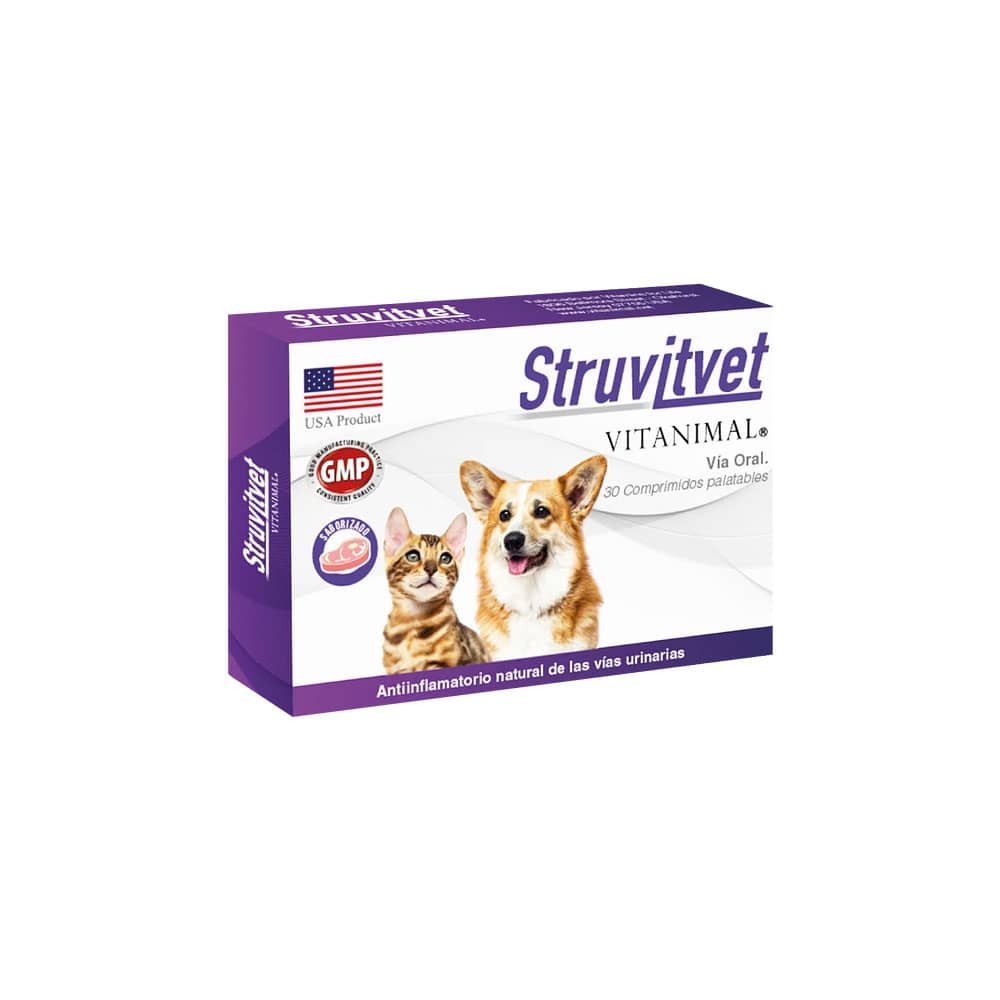 Struvitvet es un suplemento nutricional indicado como coadyuvante en la prevención y disolución de cristales de estruvita, siendo además un potente antiinflamatorio natural de las vías urinarias.